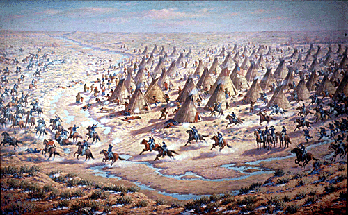 This painting shows soldiers attacking the Indian village at Sand Creek in Kiowa County, Colorado. The attack took place on the night of November 29-30, 1864, against Indians who were at peace with the United States. About 200 Cheyenne and Arapahoes, mostly women and children, were killed in this attack.